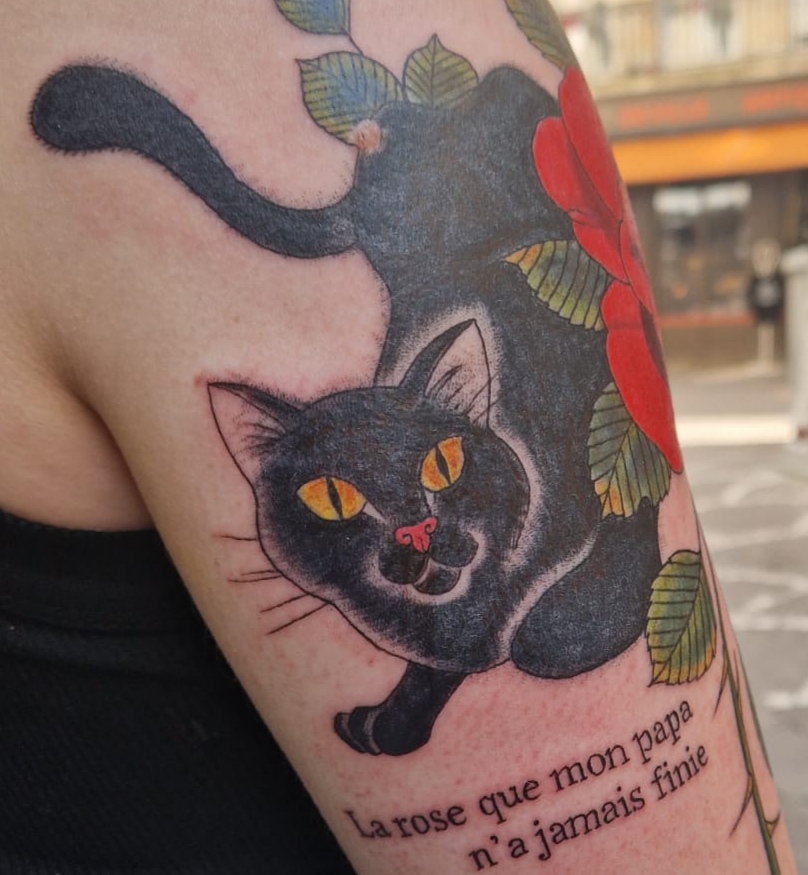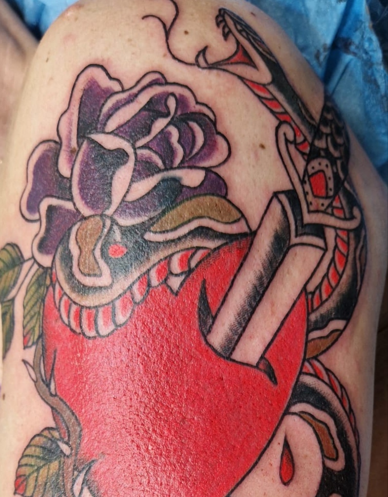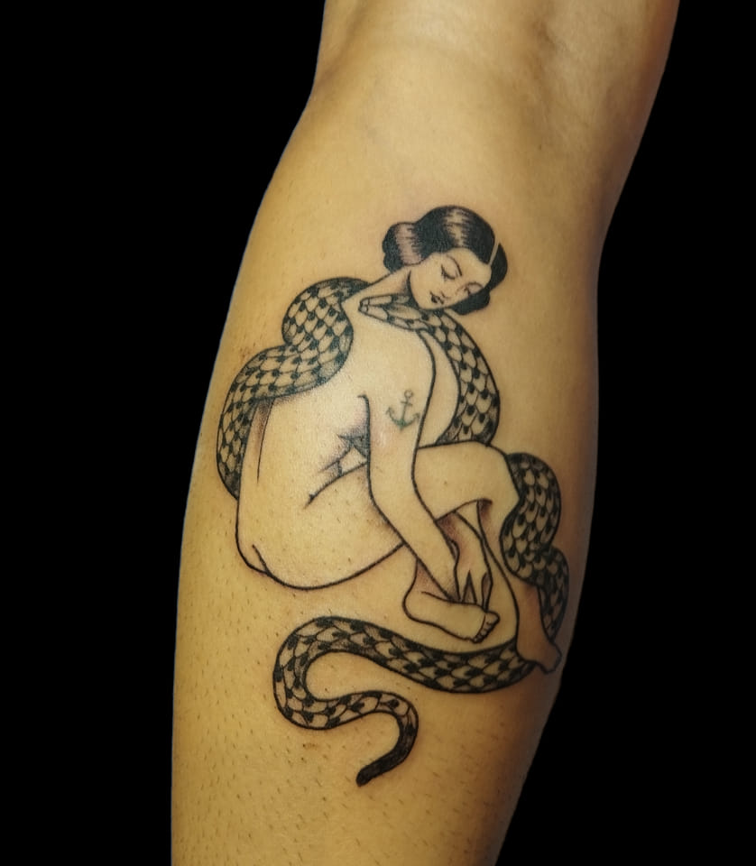 Tatouage traditionnel à la bobine depuis 2013. Initiée au tatouage à l'heure bleue à Lyon chez Dodie, Grizou est depuis 2018 résidente au salon les bobines à Saint-Etienne, 7, rue St Jean 42000.
